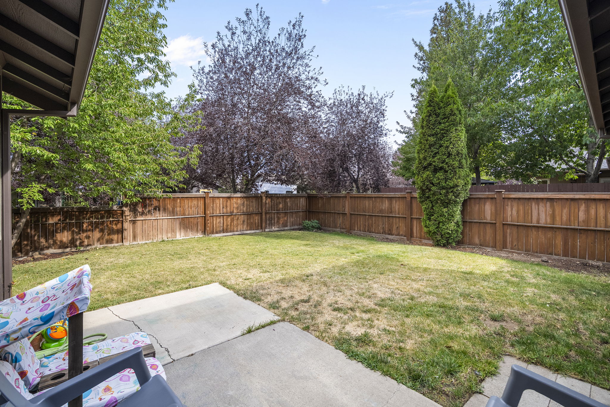 The open living room and kitchen features a gas fireplace with slate surround and windows facing north, east, and south that bring in sunlight throughout the day. An adjacent den can easily be converted to a home office or third bedroom. Recent upgrades include a new roof, furnace, and hot water heater. Outside, a spacious fenced backyard with mature trees offers plenty of room to create your own outdoor retreat. 37-acre Alpenglow Park is just a stone's throw away and includes a bouldering area, playground, event pavilion, off-leash dog area, and both paved and natural trails. Just over 10 minutes to downtown Bend.